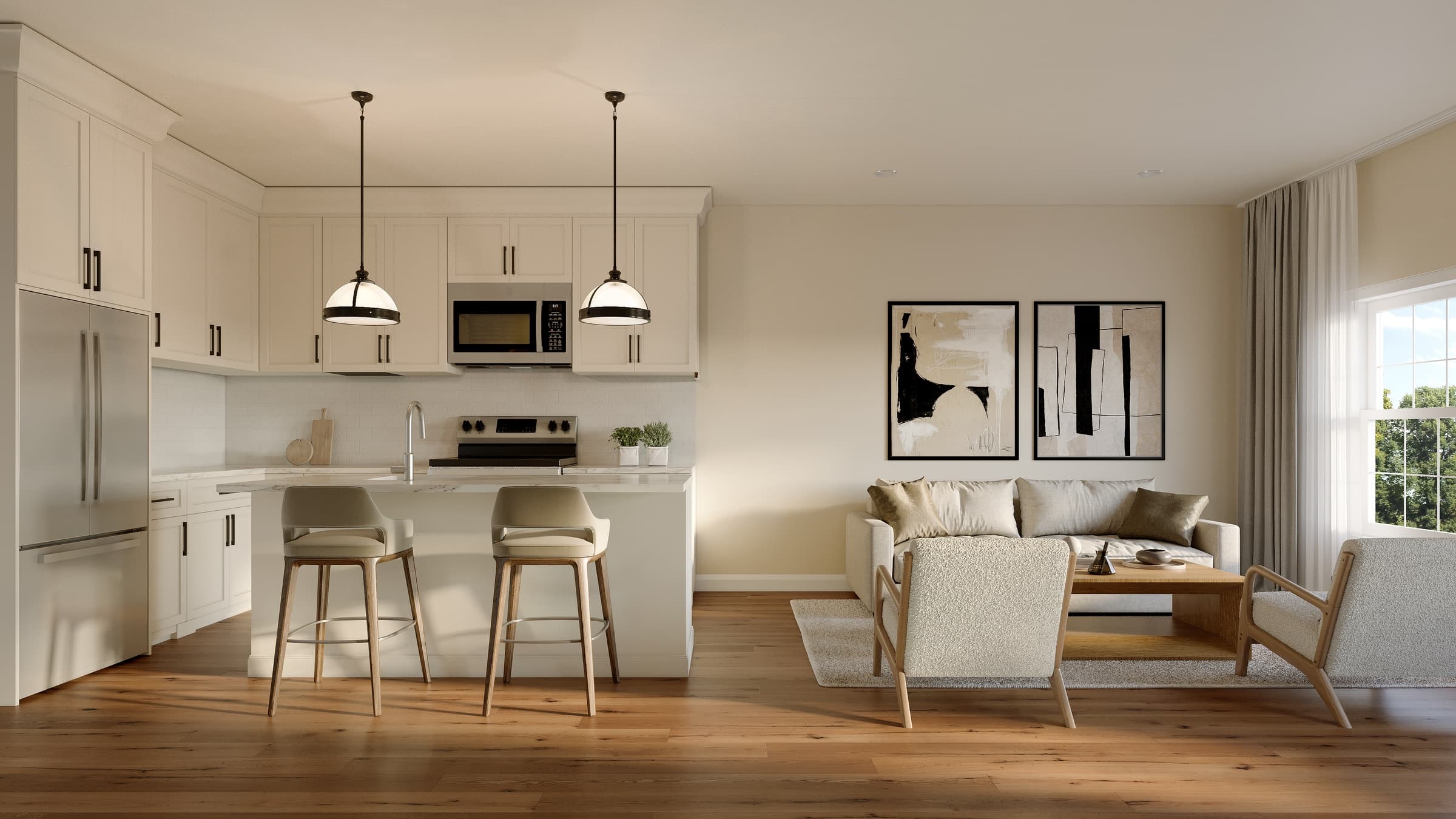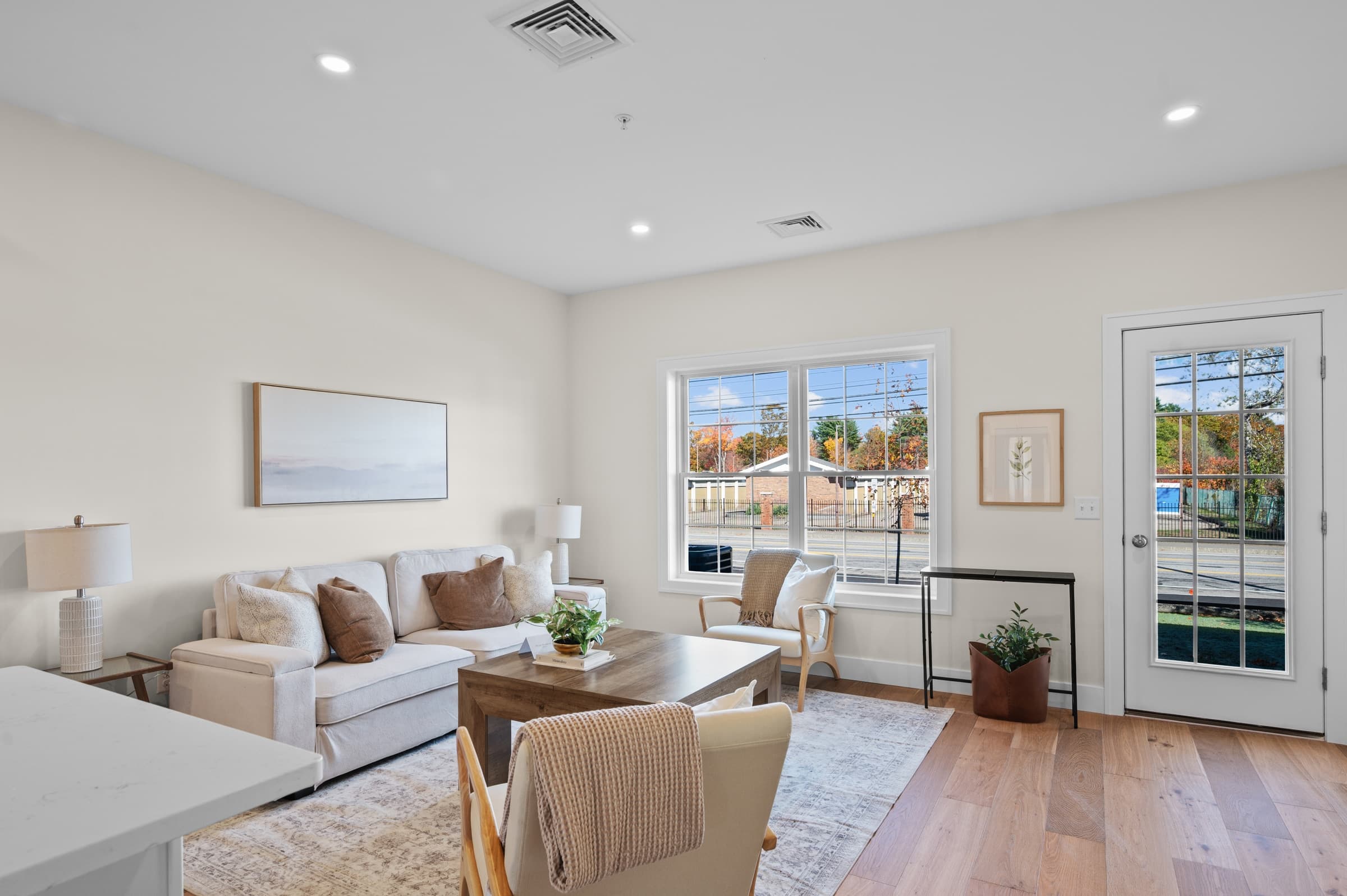 The attention to detail shines through in the carefully selected fittings and fixtures. Everything arrives move-in ready. No selections to make, no upgrades to coordinate. Just bring your family, your furniture, and you're home. • Open-concept, kitchen connected to living room • Quartz countertops and stainless appliances • Wide-plank hardwood flooring • His-and-hers closets in the primary bedroom • Fully tiled, double vanity primary bathroom • 9ft ceilings throughout • Gas heating for the New Hampshire winters • Full appliance package, move-in ready • 1-car attached garage